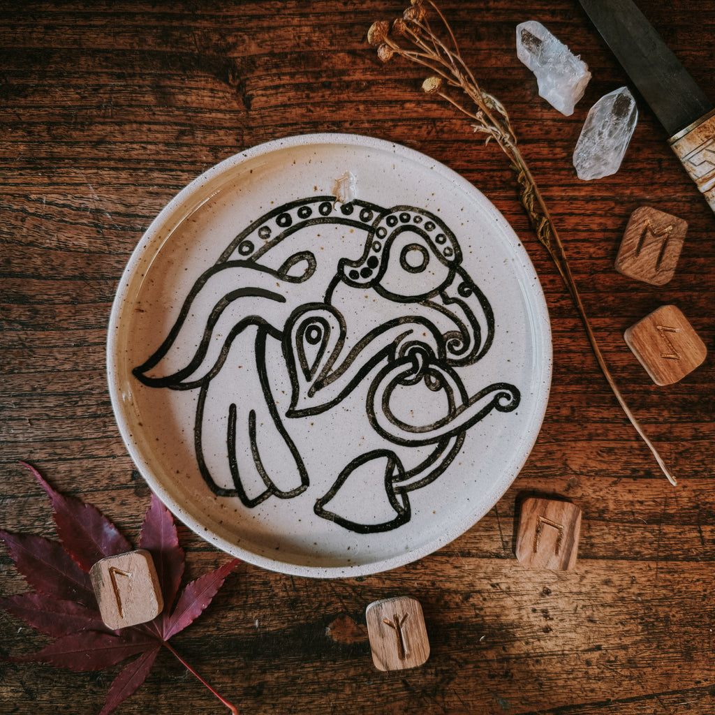 Small Plate: Mushroom Raven Plate - The Raven as a connection and symbol of the Allfather Odin, wisdom and freedom. The Mushroom as a symbol of universal knowledge, nature, evolution, growth and strength. Important aspects for your daily nourishment and reminds you with every meal on your power.